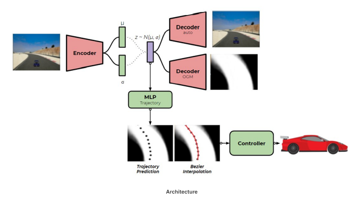 - Built an end-to-end pipeline prioritizing fast inference, robust perception, and control. The system learns a latent representation of the environment from road images, which directly regresses to Bezier control points for efficient path planning.